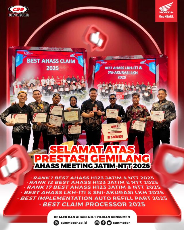 CUN MOTOR kembali membuktikan komitmennya dalam memberikan pelayanan terbaik dengan meraih berbagai penghargaan bergengsi dalam ajang AHASS Meeting Jatim–NTT 2026. Prestasi ini menjadi bukti nyata bahwa kualitas layanan dan standar operasional AHASS CUN MOTOR berada di level terbaik di wilayah Jawa Timur dan Nusa Tenggara Timur.