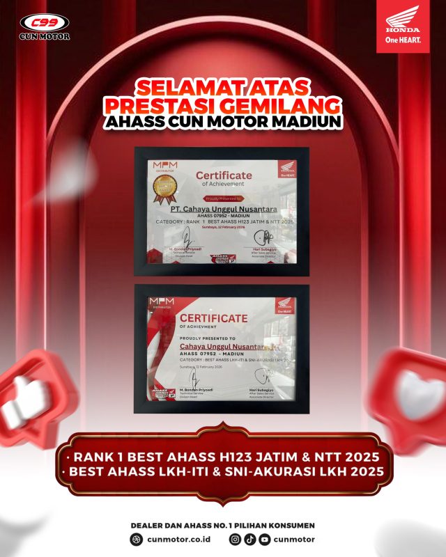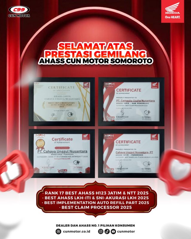 Prestasi ini tidak hanya menjadi kebanggaan internal perusahaan, tetapi juga jaminan kualitas bagi seluruh pelanggan setia CUN MOTOR.